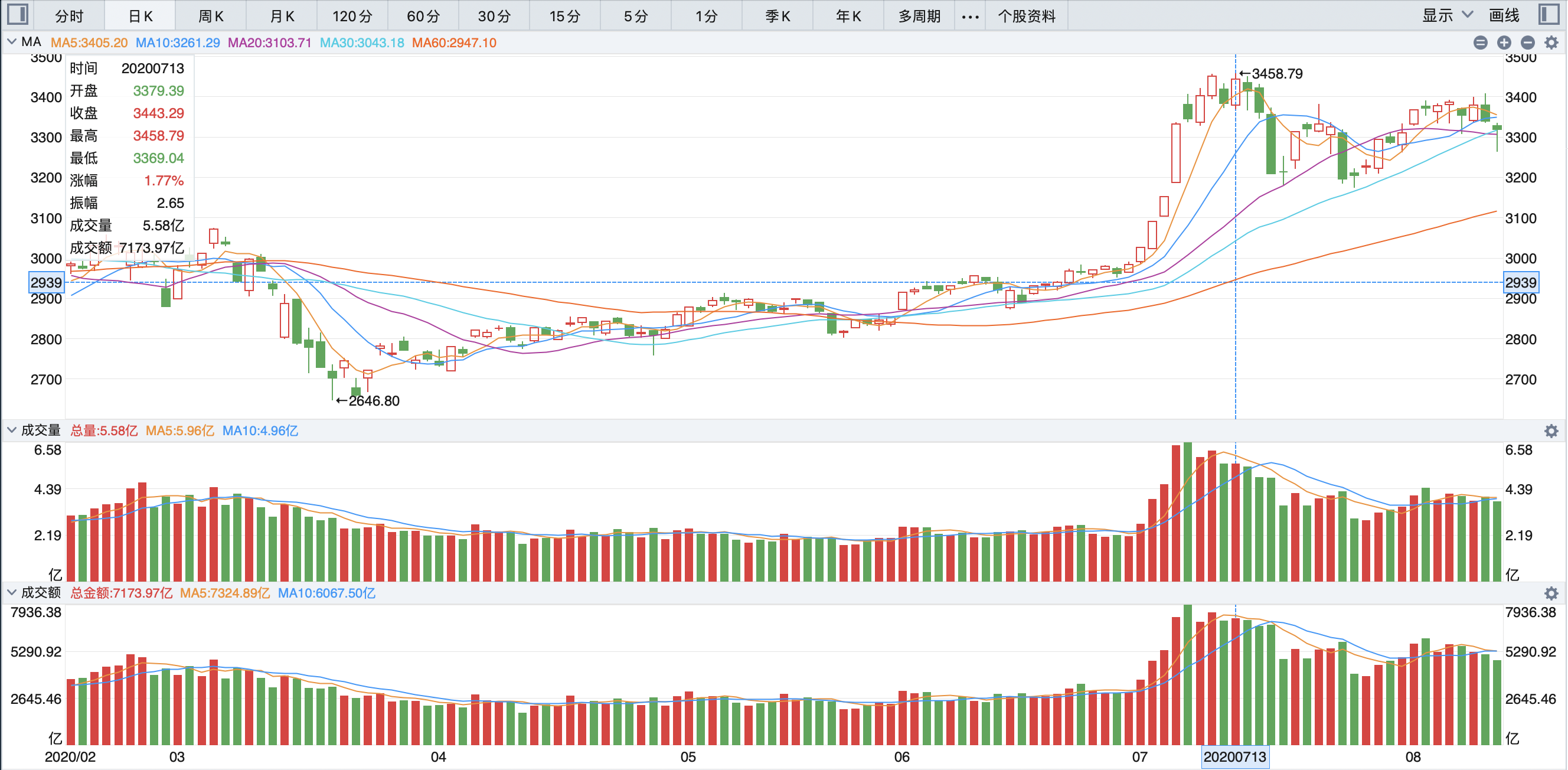 此轮小牛市中,上证指数从2020年3月19日最低点2646.8,到2020年7月13日最高点3458.79,历时4个月,涨幅30.7%。上证指数日k线如下图所示: