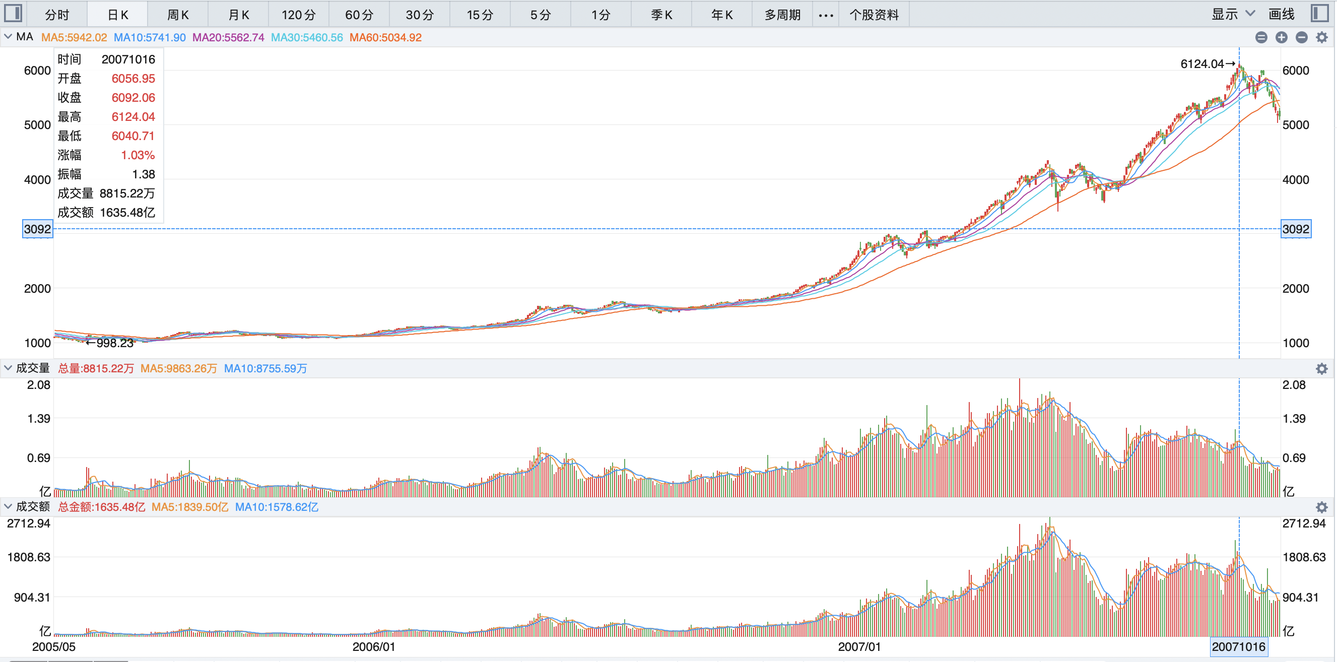 2005年到2007年,A股经历了一次大牛市。大牛市简介2007年大牛市从2005年6月6日开始,到2007年10月16日结束,上证指数从998点上涨至6124点,涨幅513%。上证指数日k线如下图所示: