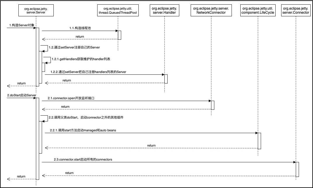 Jetty中所有的组件都会继承LifeCycle接口,Server的doStart方法调用就会调用所有已经注册到Server的组件。