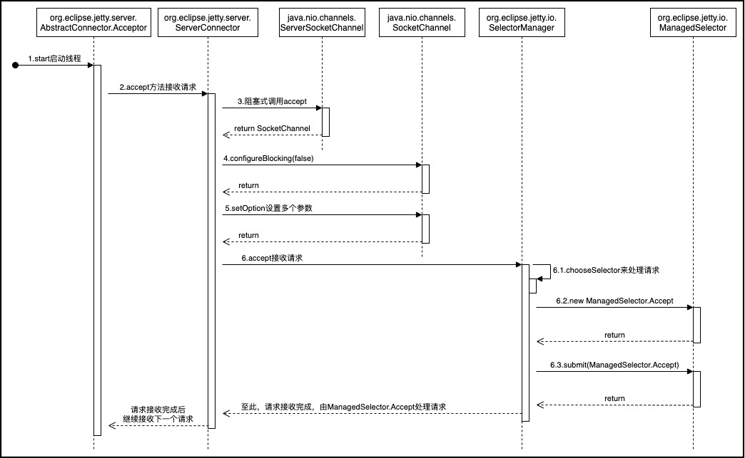 (1)Acceptor阻塞监听连接请求,当有连接请求到达时就接受连接,一个连接对应一个Channel,Acceptor将Channel交给ManagedSelector来处理。