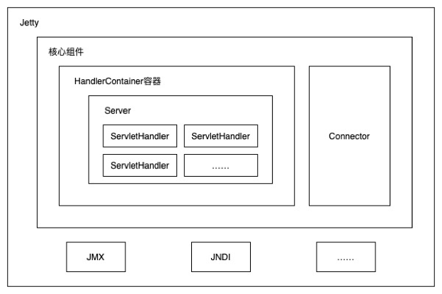 Jetty Server由多个Connector(连接器)、多个Handler(处理器),以及一个线程池组成。如下图所示: