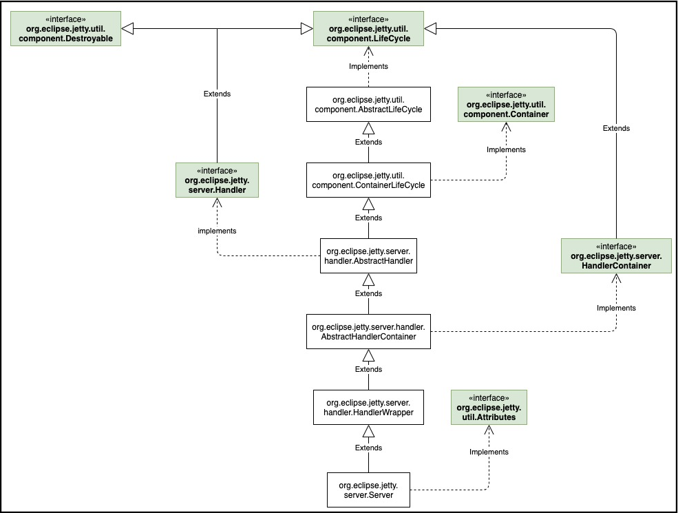 从上图中LifeCycle类的位置也可以看出:整个Jetty的所有组件的生命周期管理是基于观察者模板设计,和Tomcat的管理是类似的。