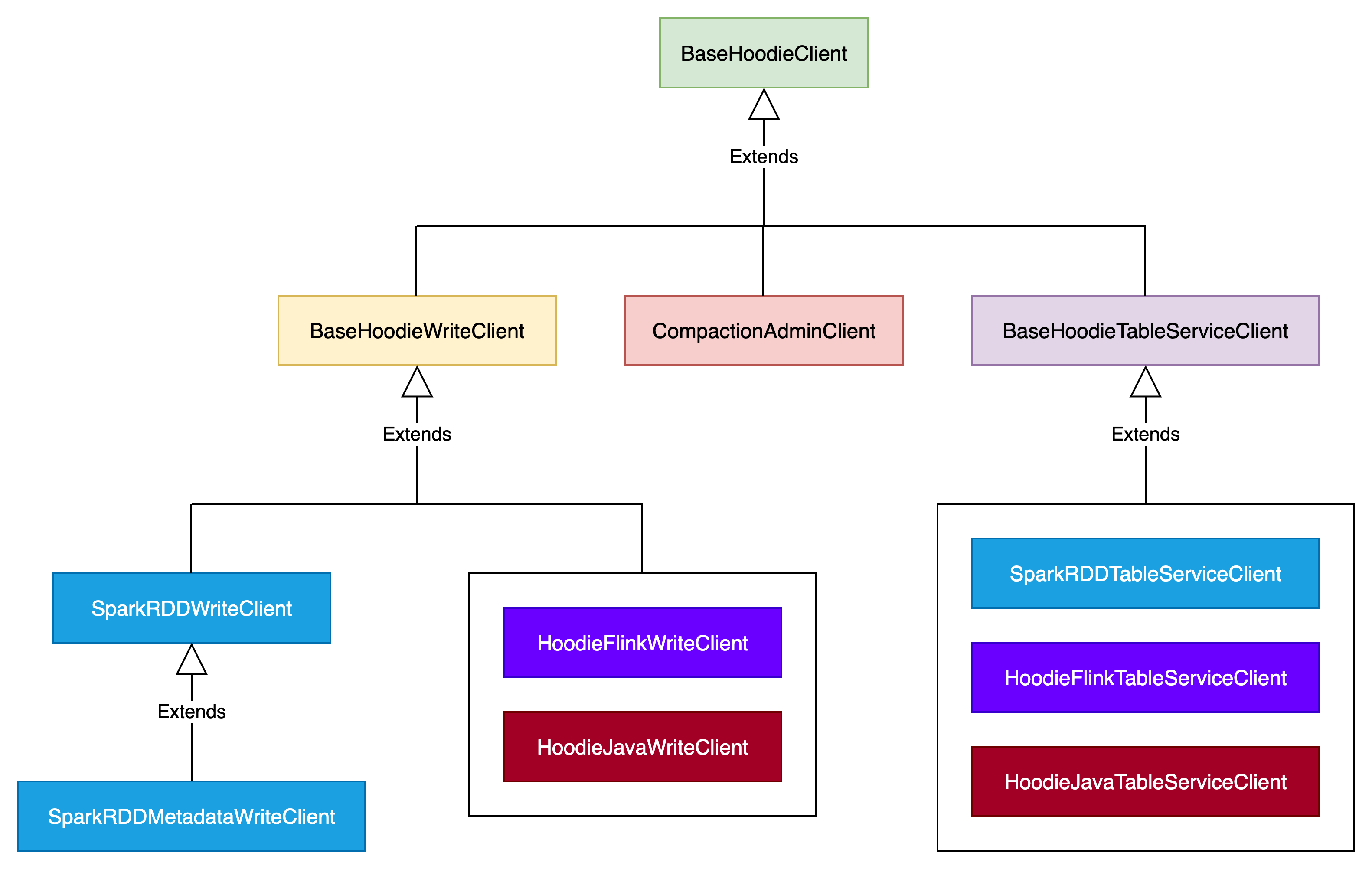 Hudi写数据是通过创建引擎兼容的写客户端实例来实现的。Spark 使用 SparkRDDWriteClient ,Flink 使用 HoodieFlinkWriteClient ,Kafka Connect 使用 HoodieJavaWriteClient 。