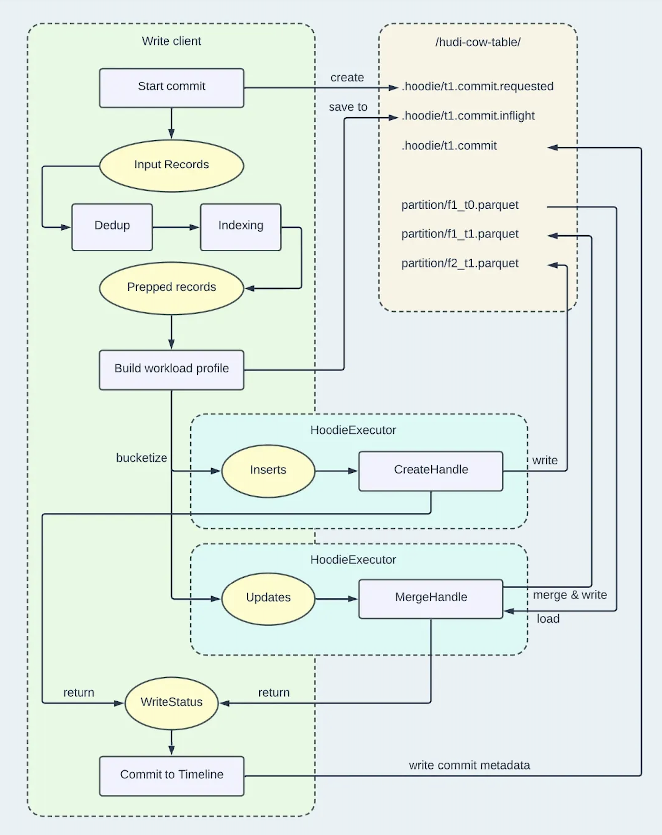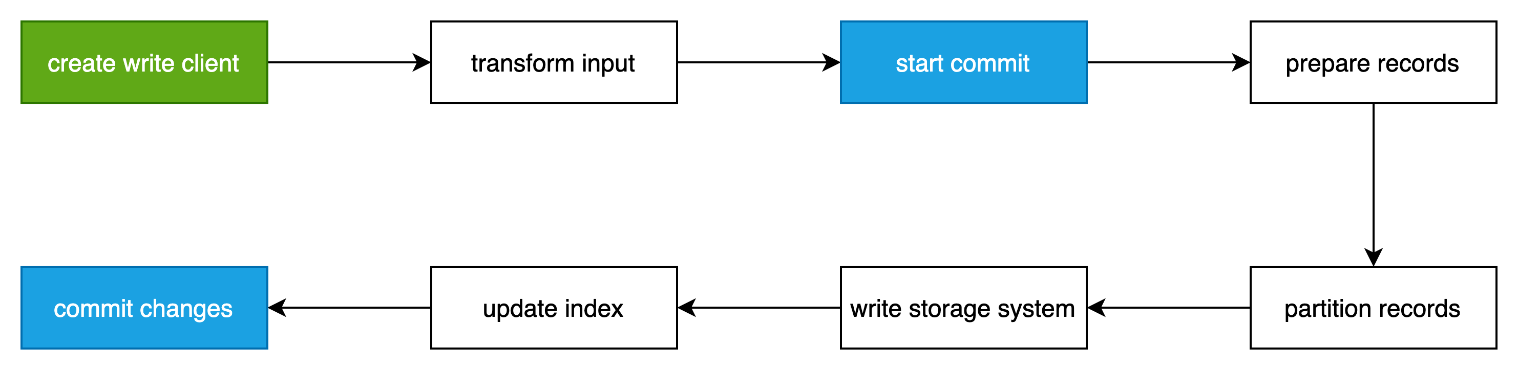 在写入客户端处理输入数据之前,会发生多个转换,包括 HoodieRecord 的构造和架构协调。