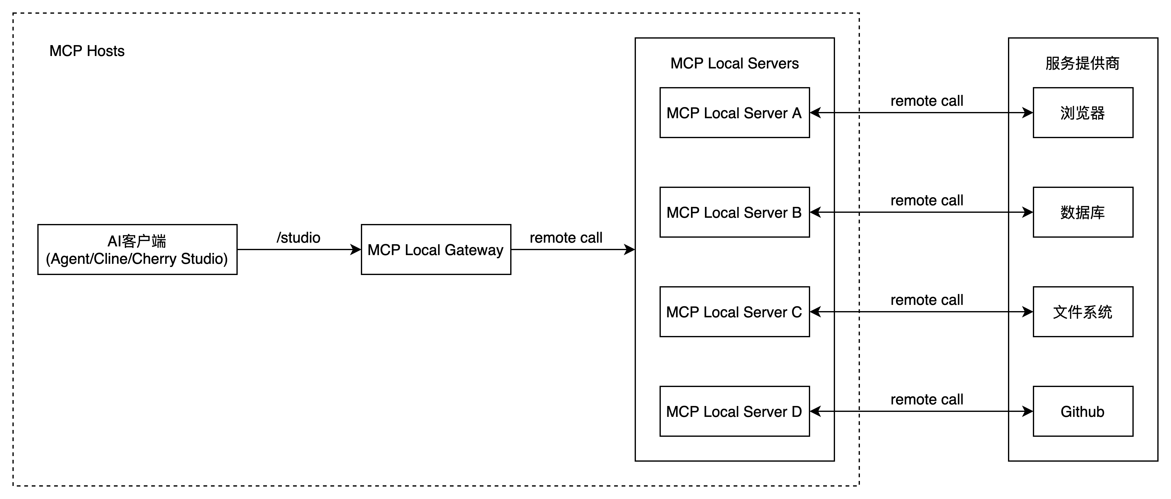 MCP Client通过STDIO连接Local Proxy,Local Proxy再通过SSE连接Remote Server。