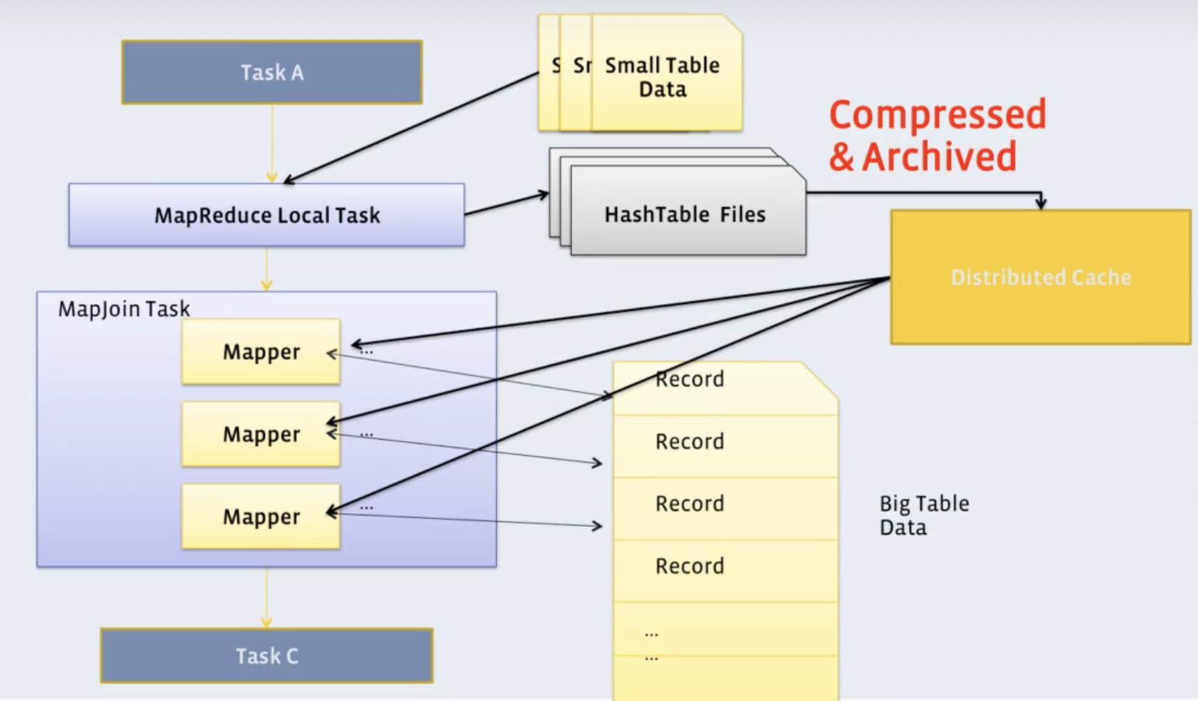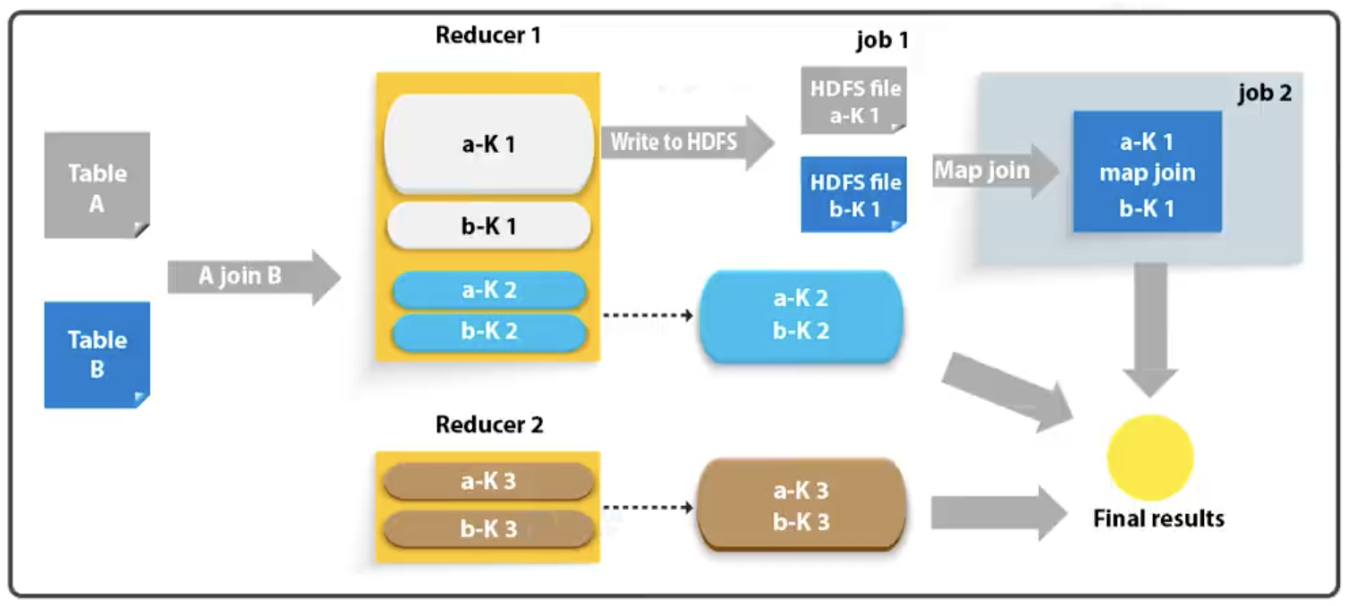 通过两个只有map阶段的Job完成一个join操作。其适合场景为“大表join小表”。若某join操作满足要求,则第一个Job会读取小表数据,将其制作为hash table,并上传至HDFS。第二个Job会先从HDFS中读取小表数据,并换存在Map Task的内存中,然后扫描大表数据,这样在map端即可完成关联操作。如下图所示: