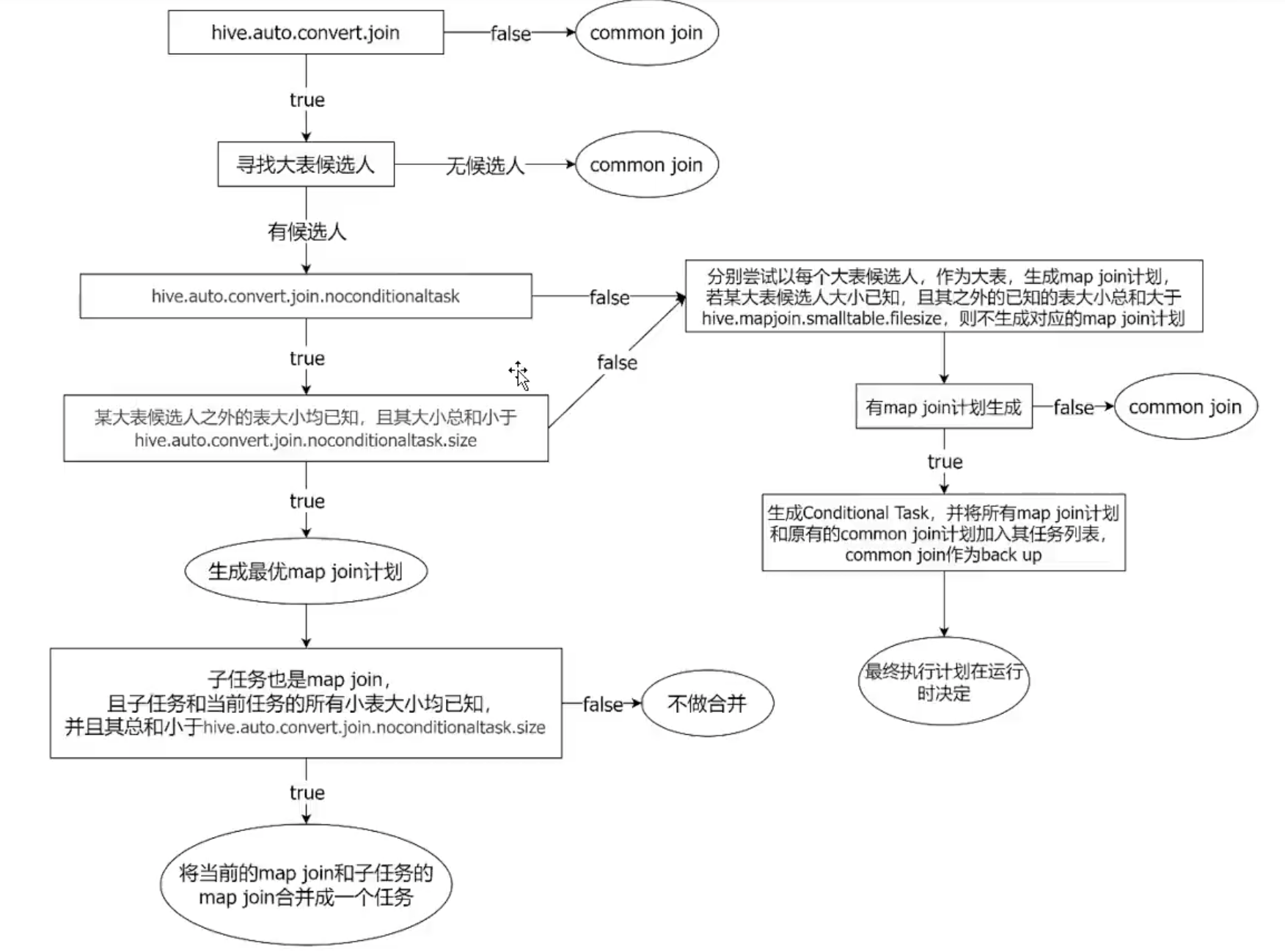 针对这种情况,Hive会在编译阶段生成一个条件任务(Conditional Task),其下会包含一个计划列表,计划列表中包含转换后的 Map Join任务以及原有的Common Join任务。最终具体采用哪个计划,是在运行时决定的。完整的逻辑如下图所示: