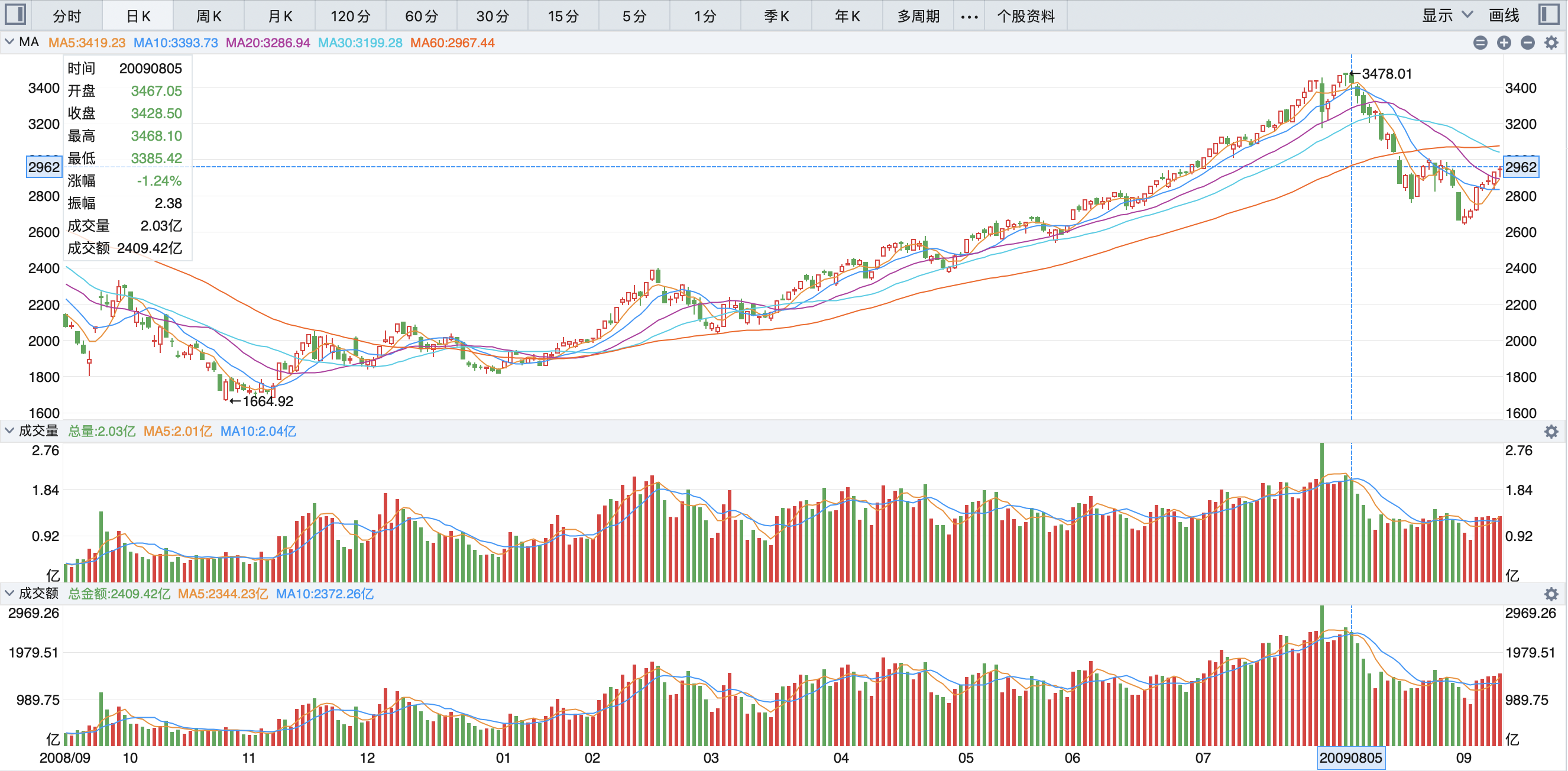 2008年小牛市是在2007年大牛市走到底下跌后进行的一次慢速上涨,从2008年10月28日到2009年8月5日,上证指数从1664.92上涨到3478.01,上涨幅度109%,上证指数日k线如下图所示: