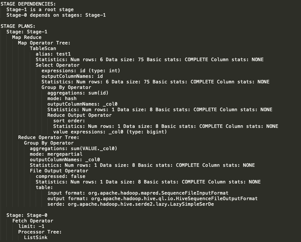 Explain呈现的执行计划,有一系列Stage组成,这一系列Stage具有依赖关系,每个Stage对应一个MapReduce Job,或者一个文件系统操作等。