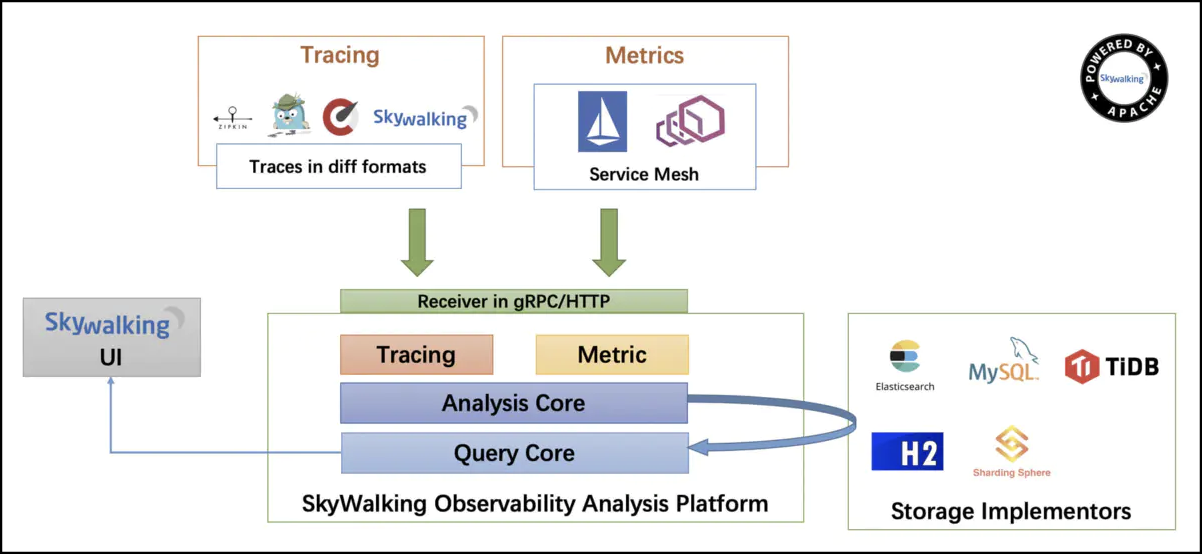 支持数据聚合, 数据分析以及驱动数据流从探针到用户界面的流程。分析包括 Skywalking 原生追踪和性能指标以及第三方来源,包括 Istio 及 Envoy telemetry , Zipkin 追踪格式化等。 你甚至可以使用 Observability Analysis Language 对原生度量指标 和 用于扩展度量的计量系统 自定义聚合分析。
