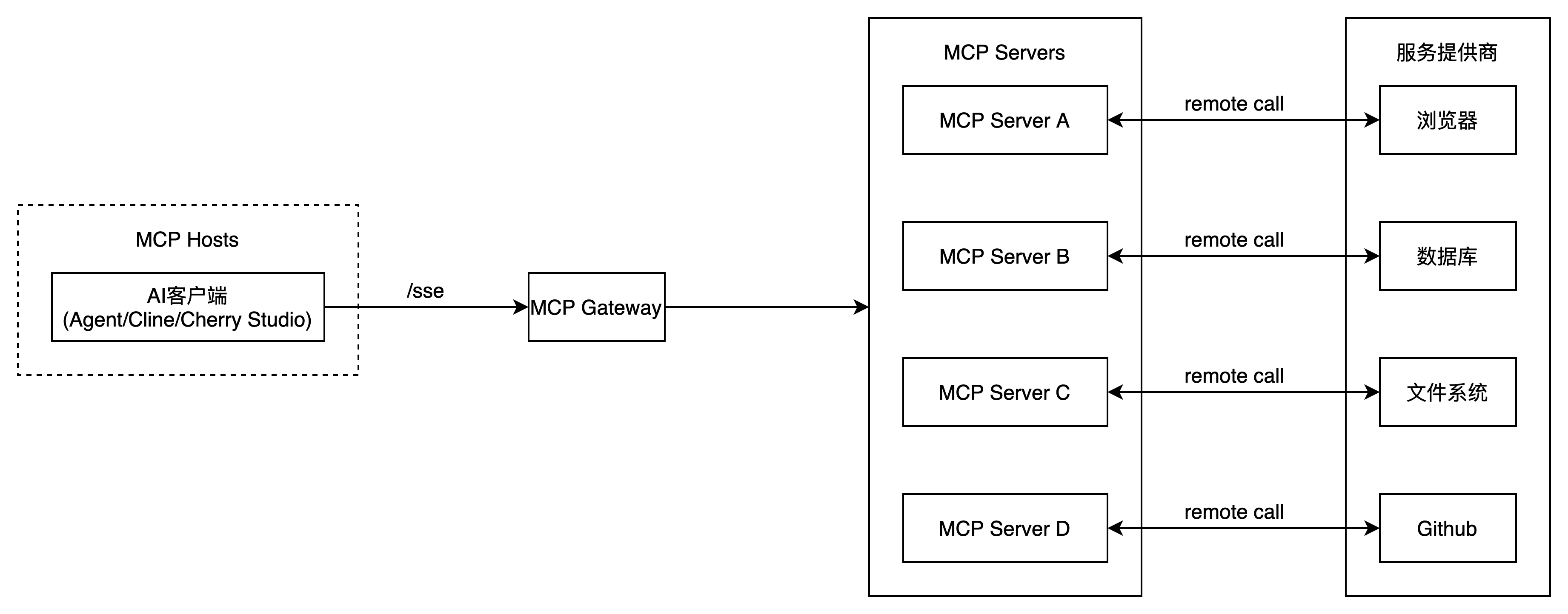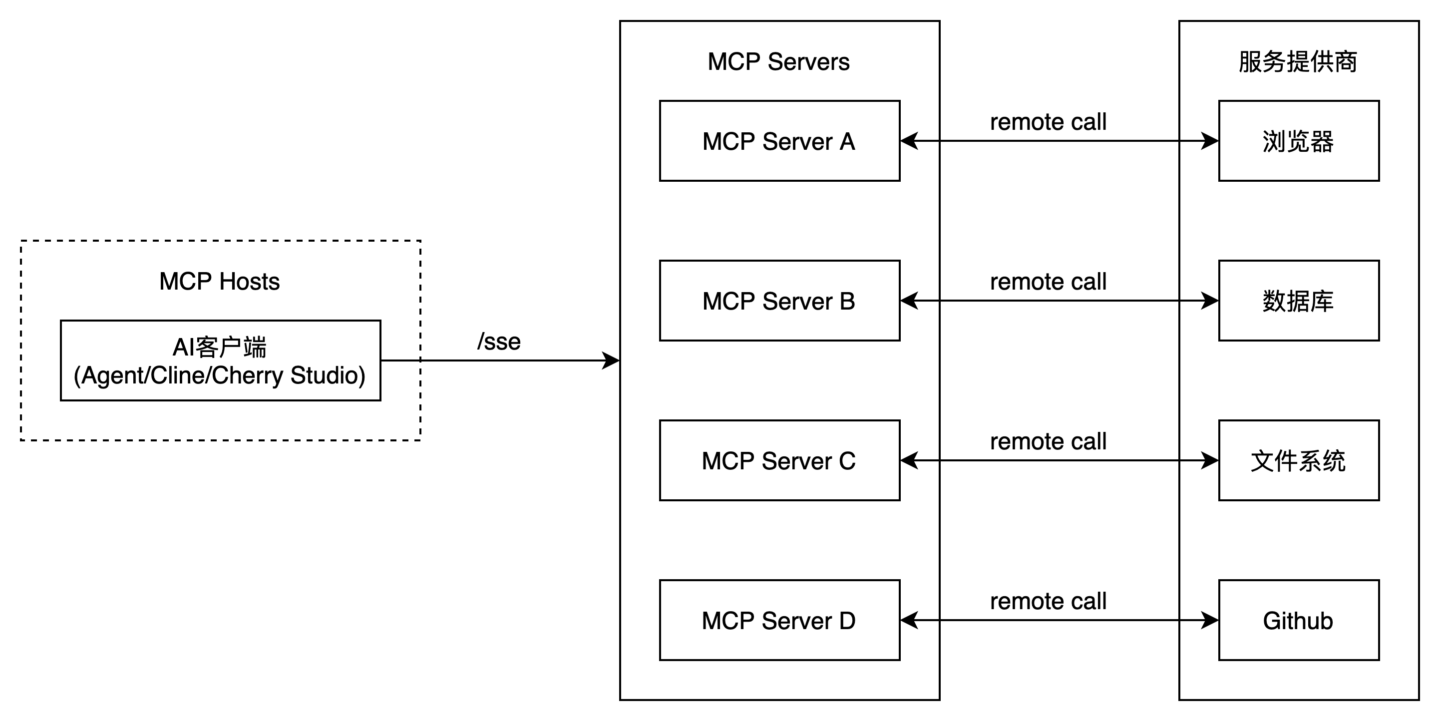 MCP Client通过SSE方式直接连接到远程MCP Server,全程保持HTTP长连接。