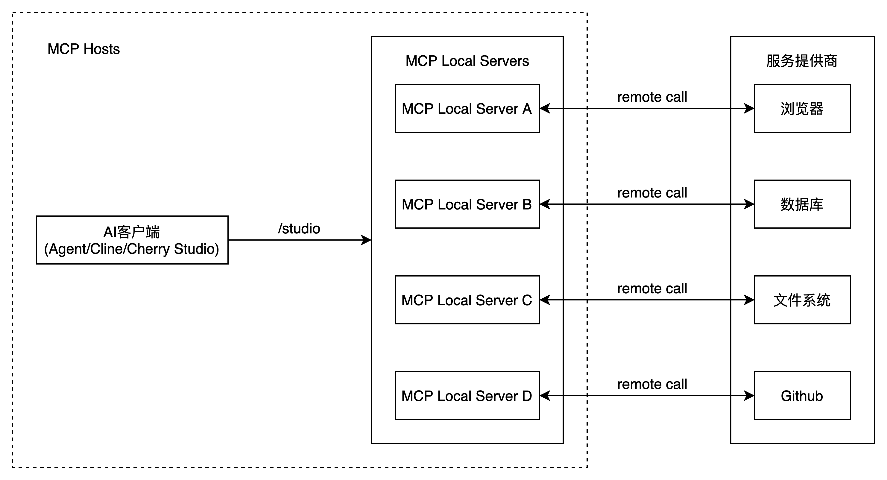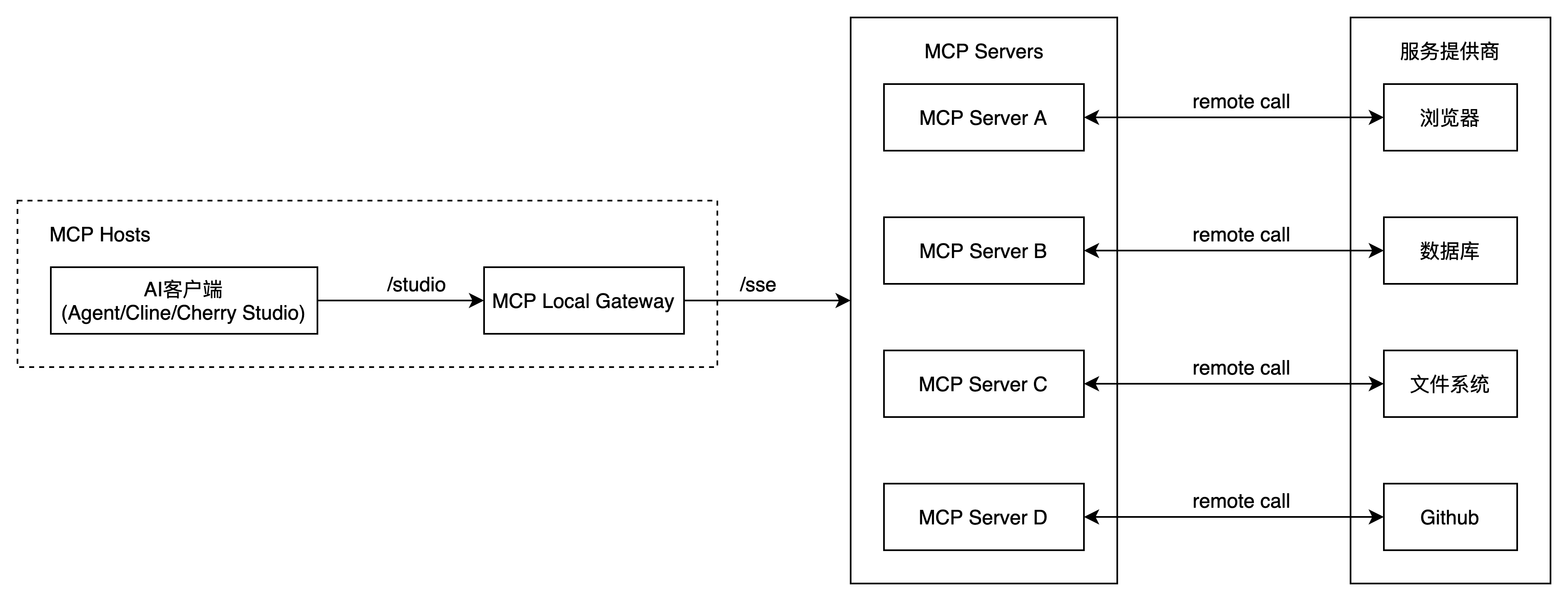 MCP Client通过STDIO连接Local Proxy,Local Proxy再通过SSE连接Remote Server。